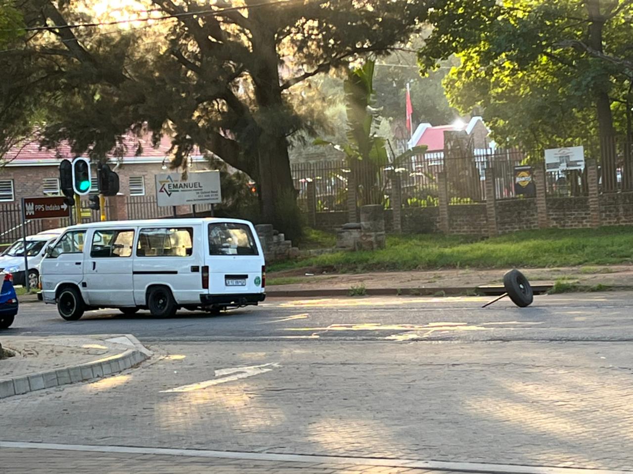 A taxi (commbie) lost a wheel! right in the middle of the street - across from the driveway of the Senior Apartment Complex.